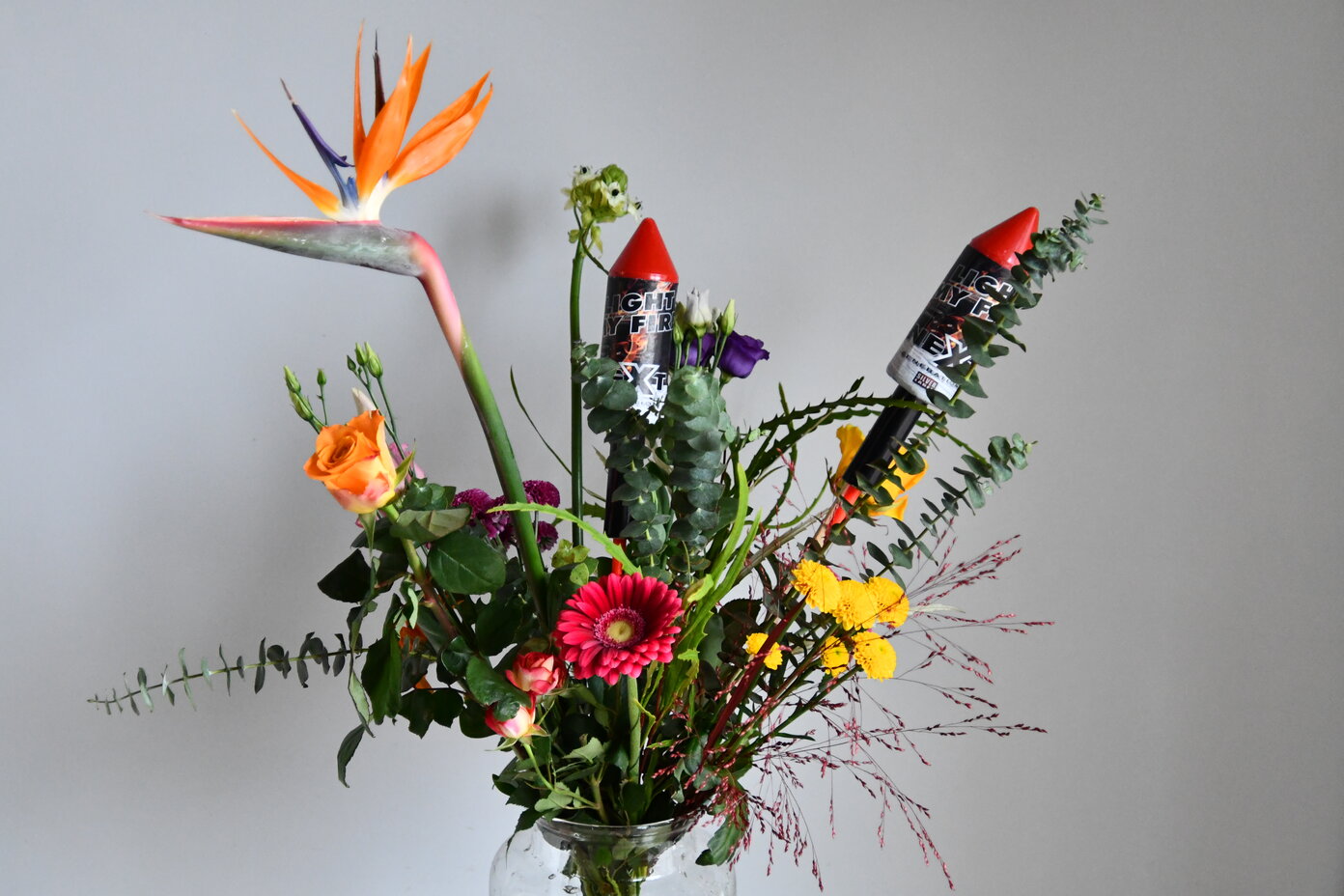 Een speels plukboeket in diverse felle kleuren. Geheel in de sfeer van Oud & Nieuw.