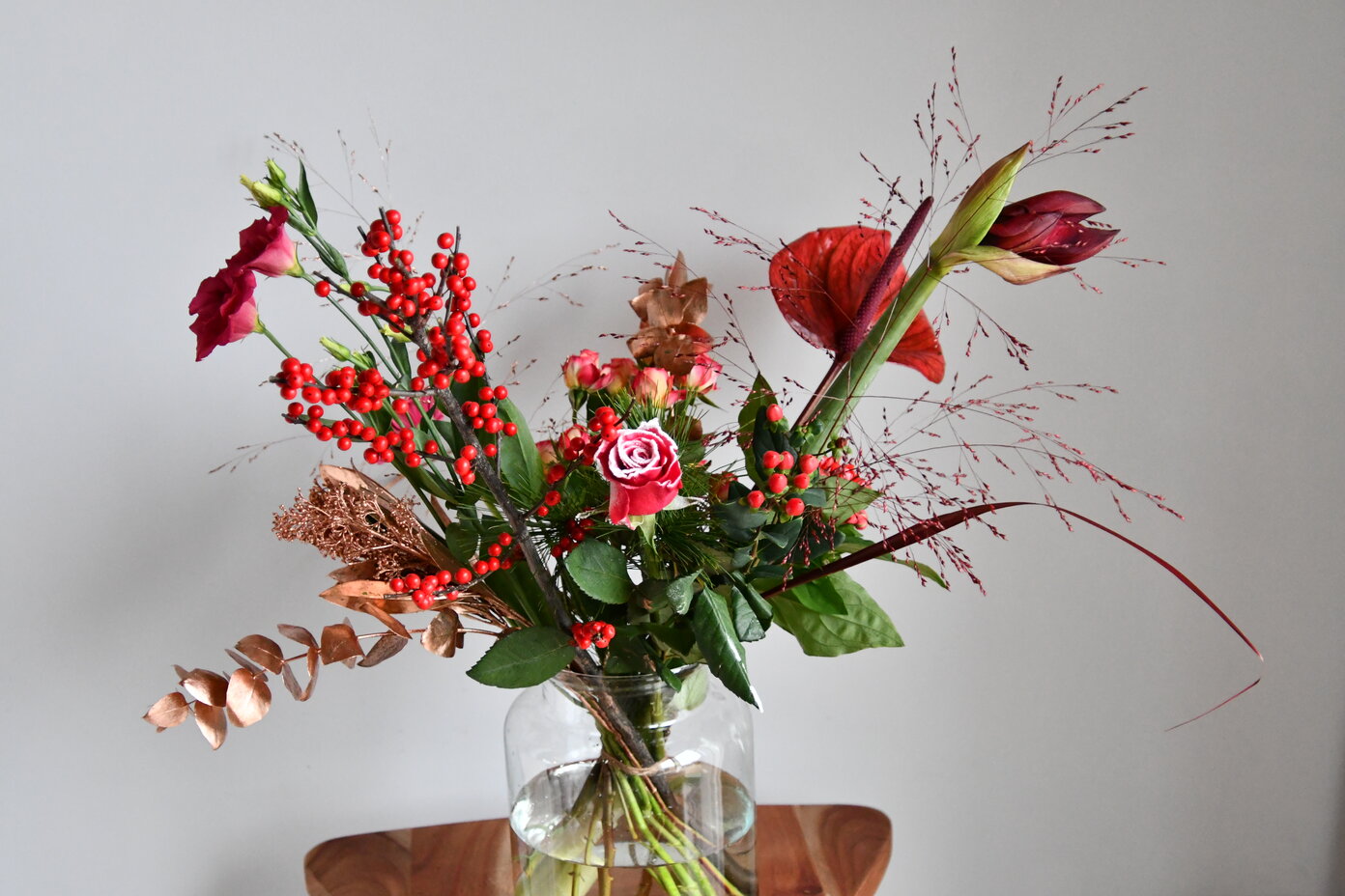 Een plukboeket samengesteld doormiddel van diverse rode bloemen, geheel in kerstsfeer.